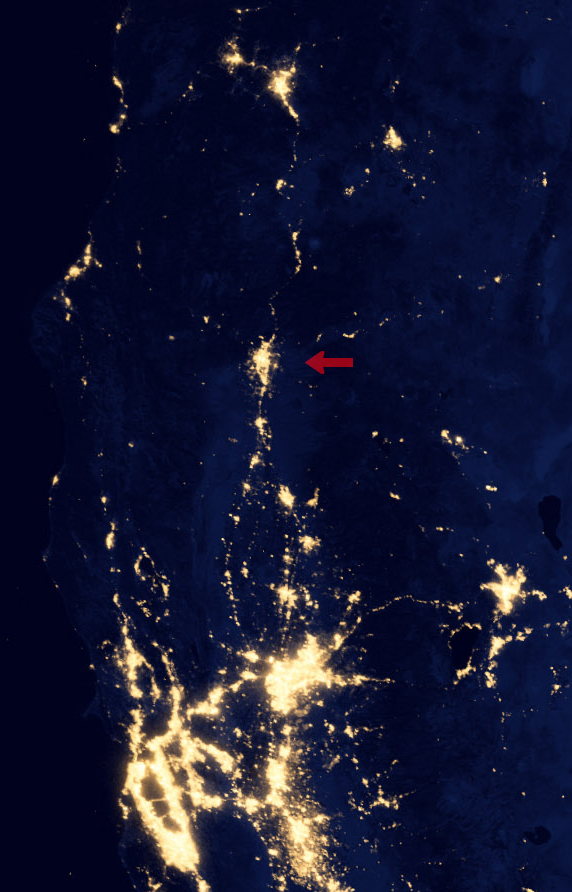 NASA recently published hi-def imagery of Earth at night. Redding is pointed out below. I was surprised at the brightness of our urban light, from miles above.