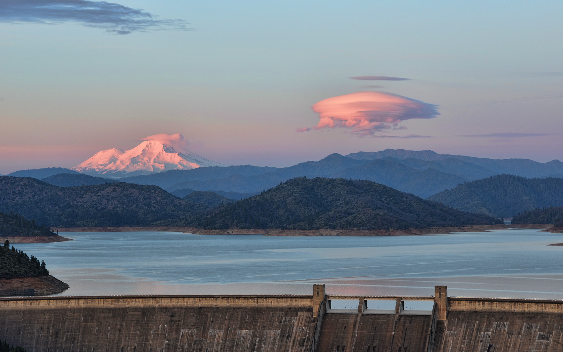 This was taken yesterday. So achingly beautiful, it brought a tear to my eyes. We live with these natural miracles every day, but it never gets old. Two glowing pink structures in snow and mist above the lake. This photo is my new screen background at 1920 X 1200 pixels, and if you click on it you can get it full size.